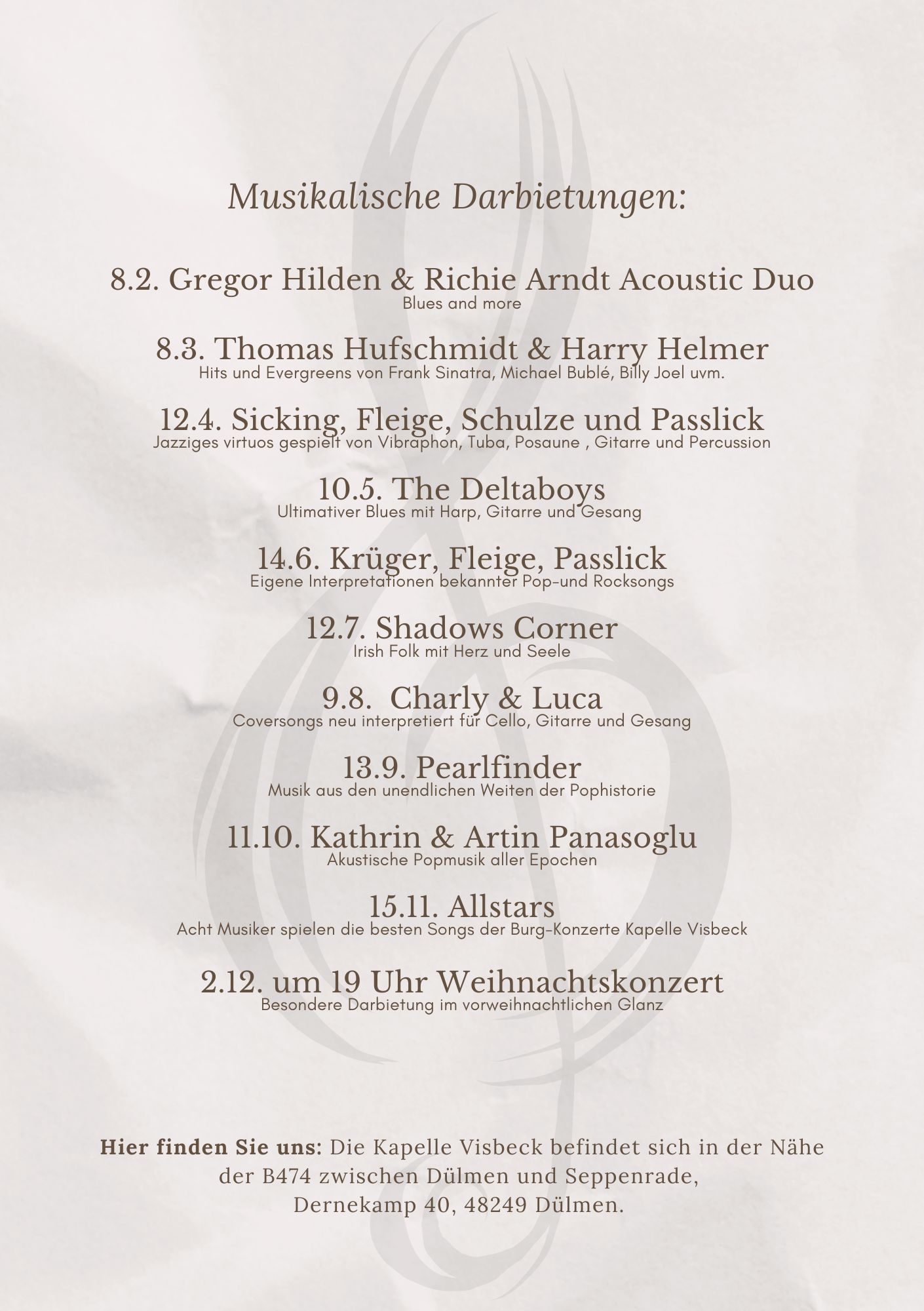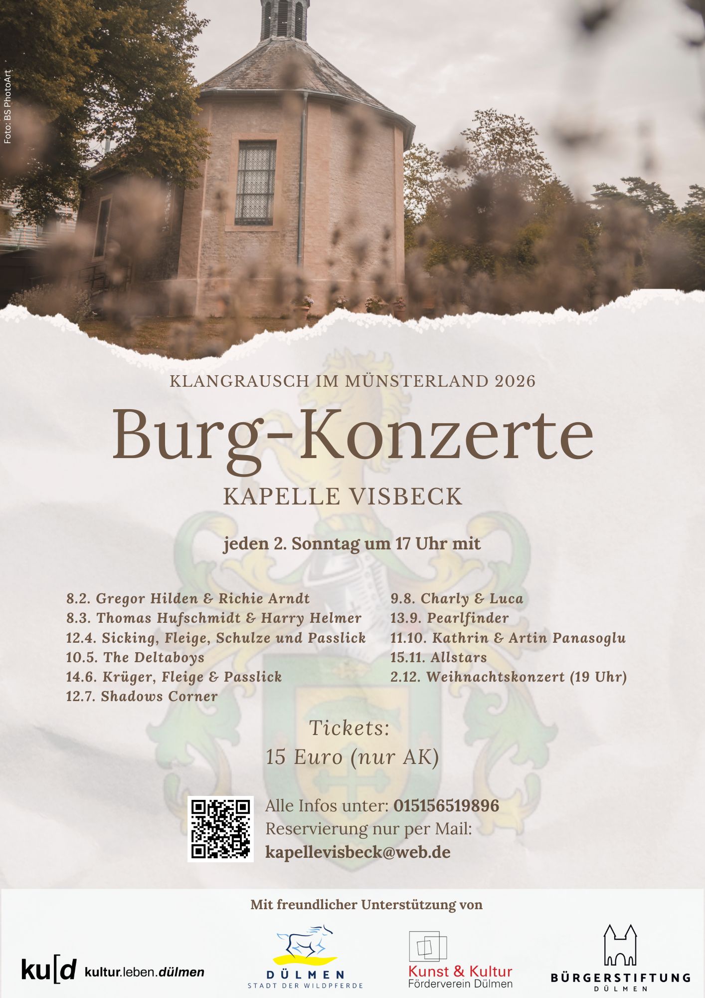 Die Burg-Konzerte Visbeck stehen für besondere Konzertabende in einzigartiger Atmosphäre. In der Kapelle am Haus Visbeck treffen hochwertige Live-Musik, historische Kulisse und persönliche Nähe aufeinander. Seit drei Jahren begeistert die Konzertreihe Musikliebhaber:innen aus dem Münsterland und darüber hinaus. Auch 2026 erwartet die Gäste ein vielfältiges Programm aus Jazz, Blues, Pop, Folk und akustischer Musik – handverlesen, nahbar und mit viel Gefühl.