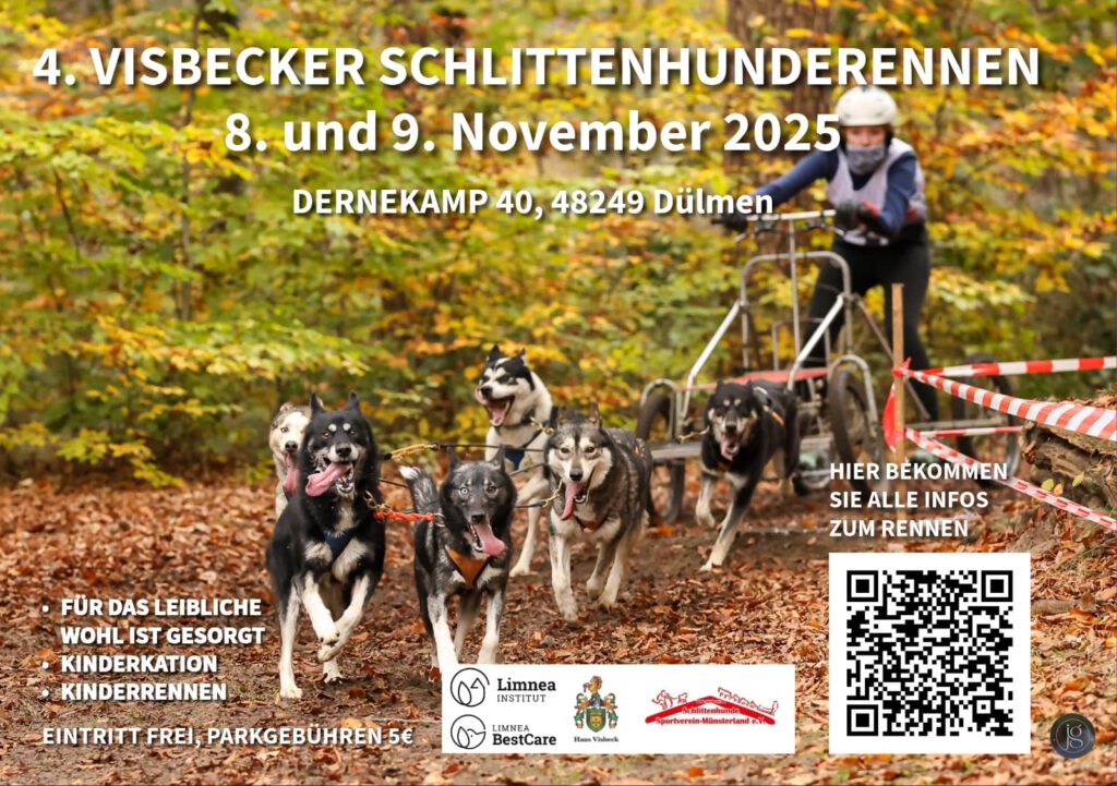 Am 8. und 9. November 2025 verwandelt sich das Areal um Haus Visbeck in Dülmen in eine aufregende Bühne für den Schlittenhundesport. Zwischen Seppenrade und Dülmen, direkt an der B 474, findet das 4. Visbecker Schlittenhunderennen statt.